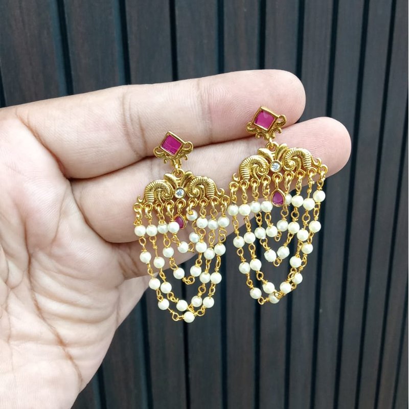 RUBY EMBELD STONE WITH 3 LAYERS OF PEARL CHAIN DESIGN EARING